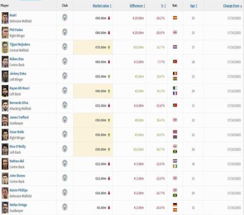 曼城球员身价变更:罗德里、福登下跌2000万欧