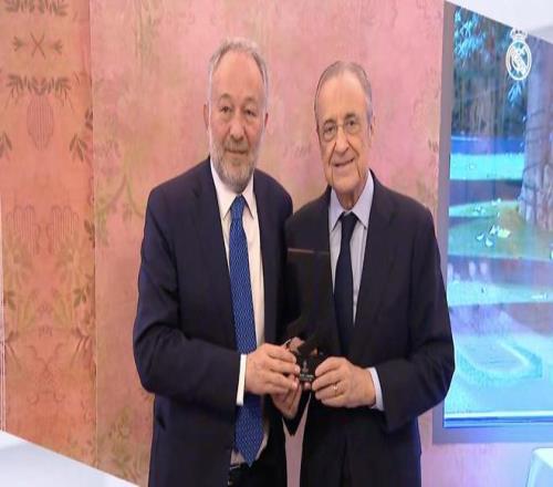 欧冠联赛阶段第三轮,皇家马德里将主场对阵尤文图斯,赛前,两家俱乐部主席出席高层会议,并互赠礼物。