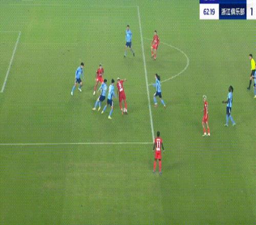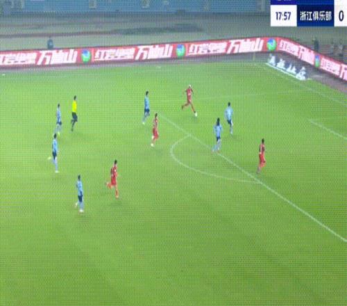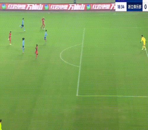 第55分钟,王钰栋突入禁区传中,卡列洛凌空将球踢进大门,浙江队扳平比分。